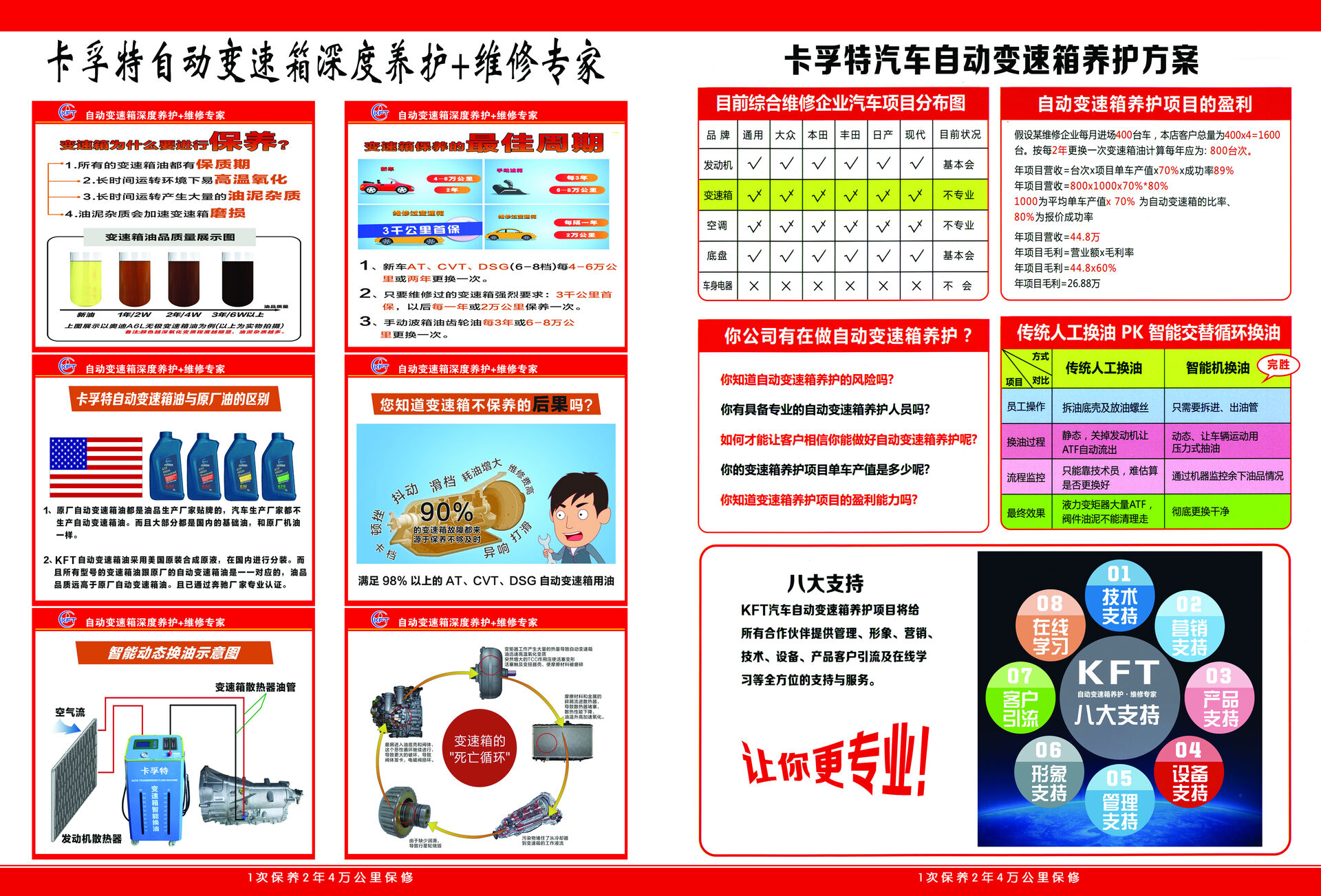 2、自动变速箱养护方案:使用卡孚特自动变速箱智能交换设备,按规范使用卡孚特油品,并对能更换滤网及油底垫的车型进行更换,通过智能交换设备进行养护且用油量不低于12升;